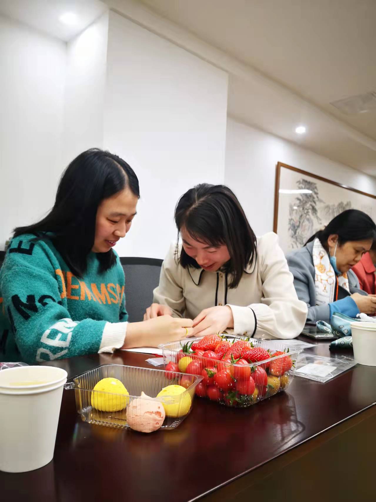 為每位“女神”準備了繩編工具包、水果、點心、鮮花等,觀看了繩編的完整視頻,在怡然恬靜的氛圍中體驗繩編的樂趣和意境,感受傳統(tǒng)繩編文化的魅力和博大精深。大家認真學習,互相探討交流,用自己靈巧的雙手纏、繞、卷、勾,最終制作出精美的手繩。