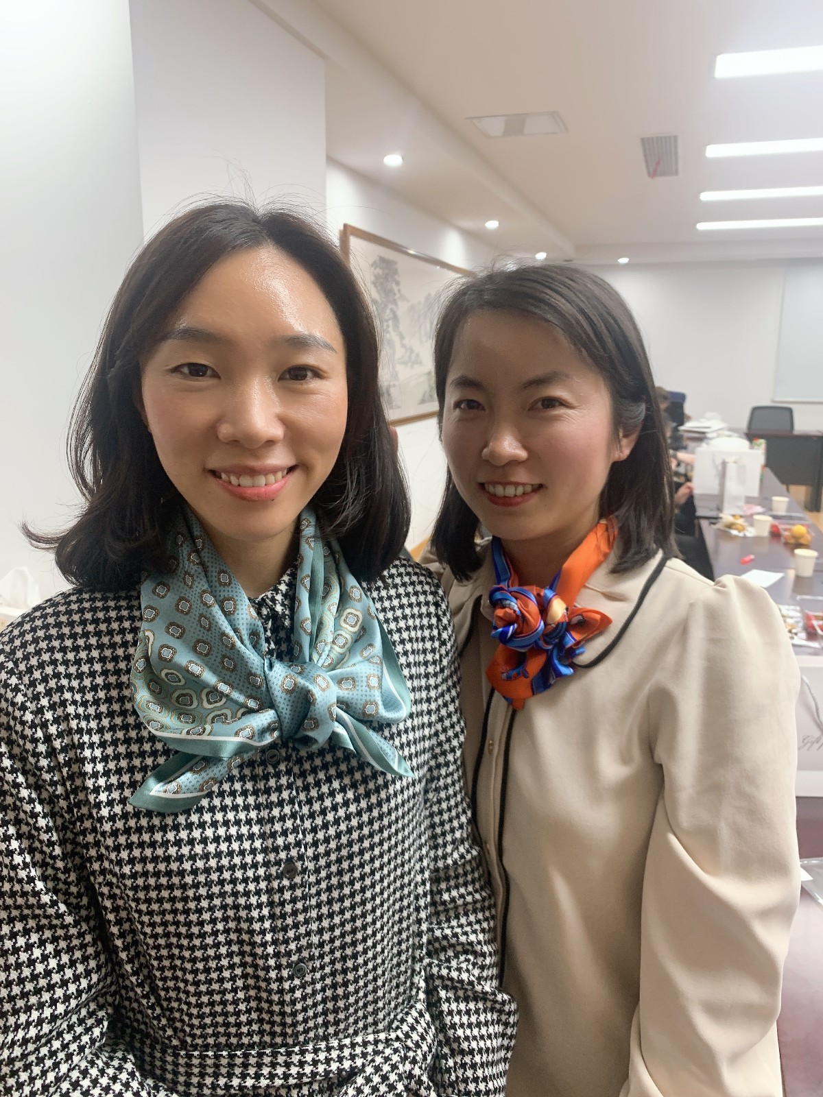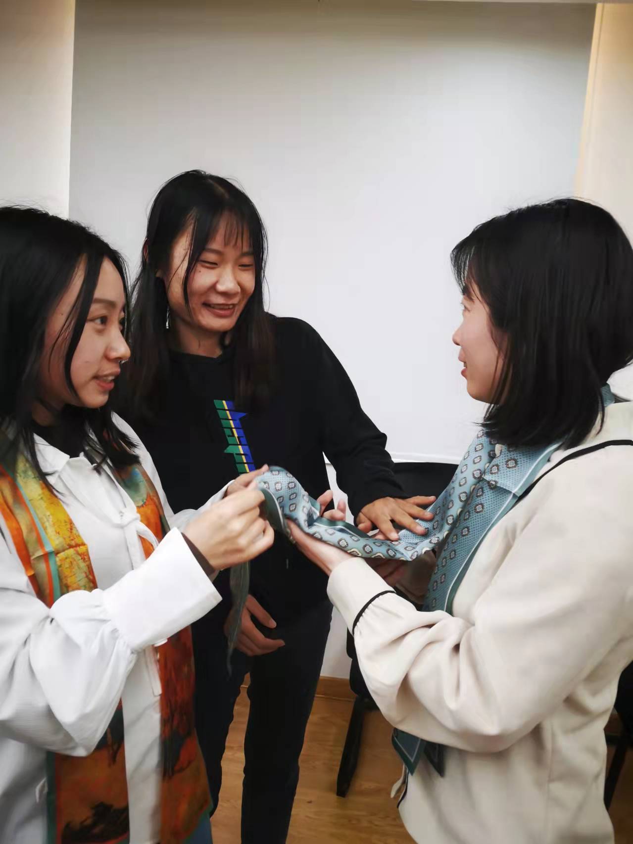 大家快樂地打開“絲巾”盲盒后,一起學習了多種系絲巾方法。大家享受著搭配色彩、設(shè)計造型、相互系絲巾帶來的樂趣和美好體驗,展示著各自的才藝。